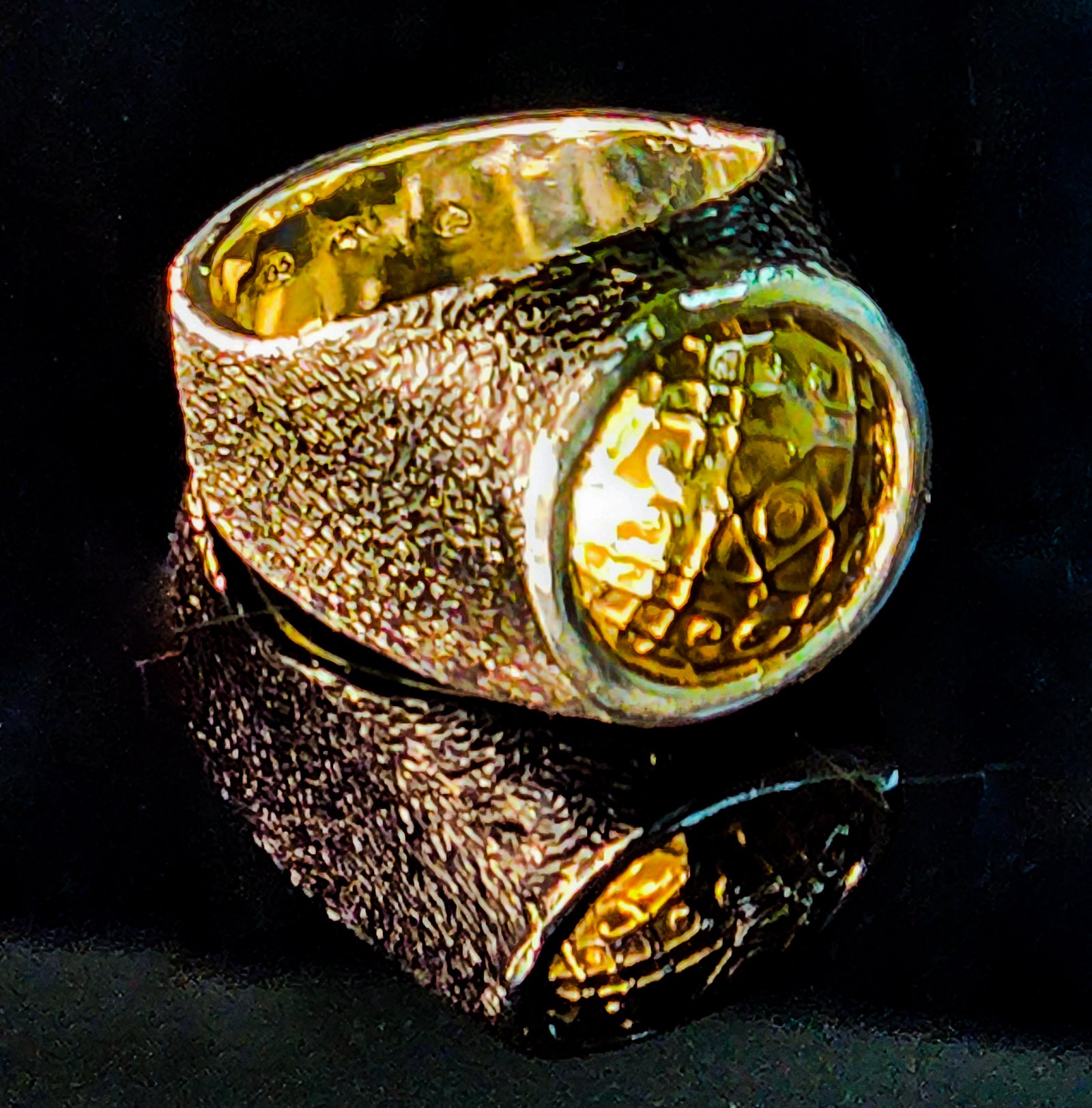 The warm coral-pink sapphire contrasts beautifully with the cool luster of silver and gold, embodying strength, grace, and balance. Each hammer mark and carved line tells the story of craftsmanship — forged by hand, refined by fire.