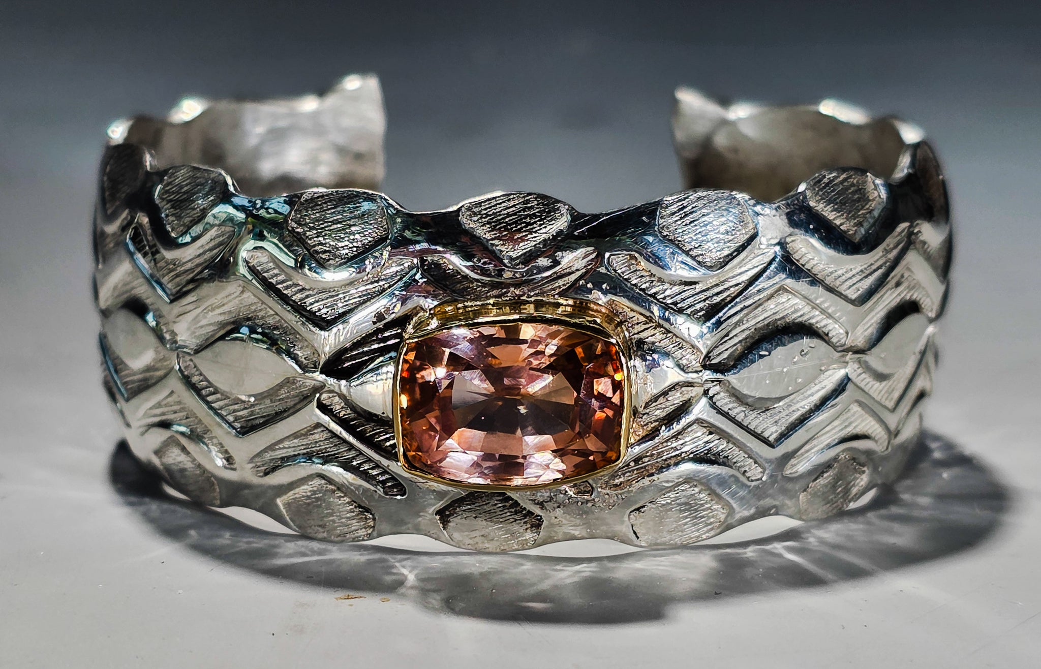 A bold, hand-forged fine silver bracelet featuring a radiant Padparadscha sapphire, framed in a custom 18K gold bezel. The patterned silver surface is sculpted with precision, creating rhythmic textures that echo the organic flow of molten metal.
