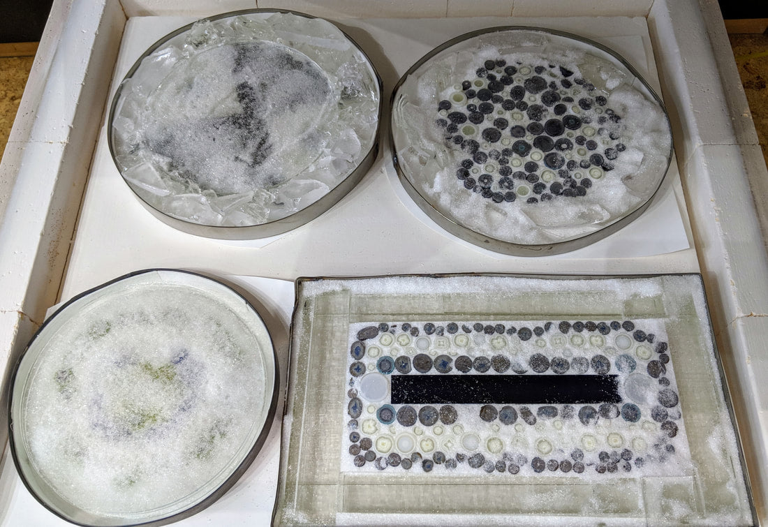 The next step was figuring out what to do with the murrine I had made. I decided to make a drop ring vase by fusing this murrine into a blank and then using a drop ring mold to slump a vessel. I fabricated a 3/4 inch stainless steel rings in my shop then added fiber paper 1 /16 inch to inside ring. Held fiber paper on w Elmer's glue and then placed on kiln shelf paper. Then stacked murrini in center of 2 sizes of blanks. Decided [...]