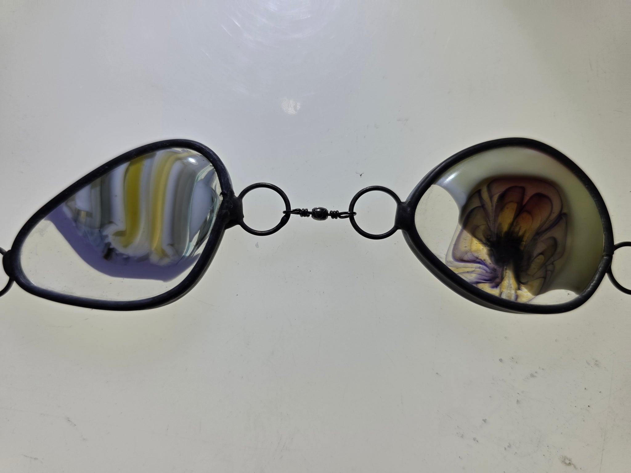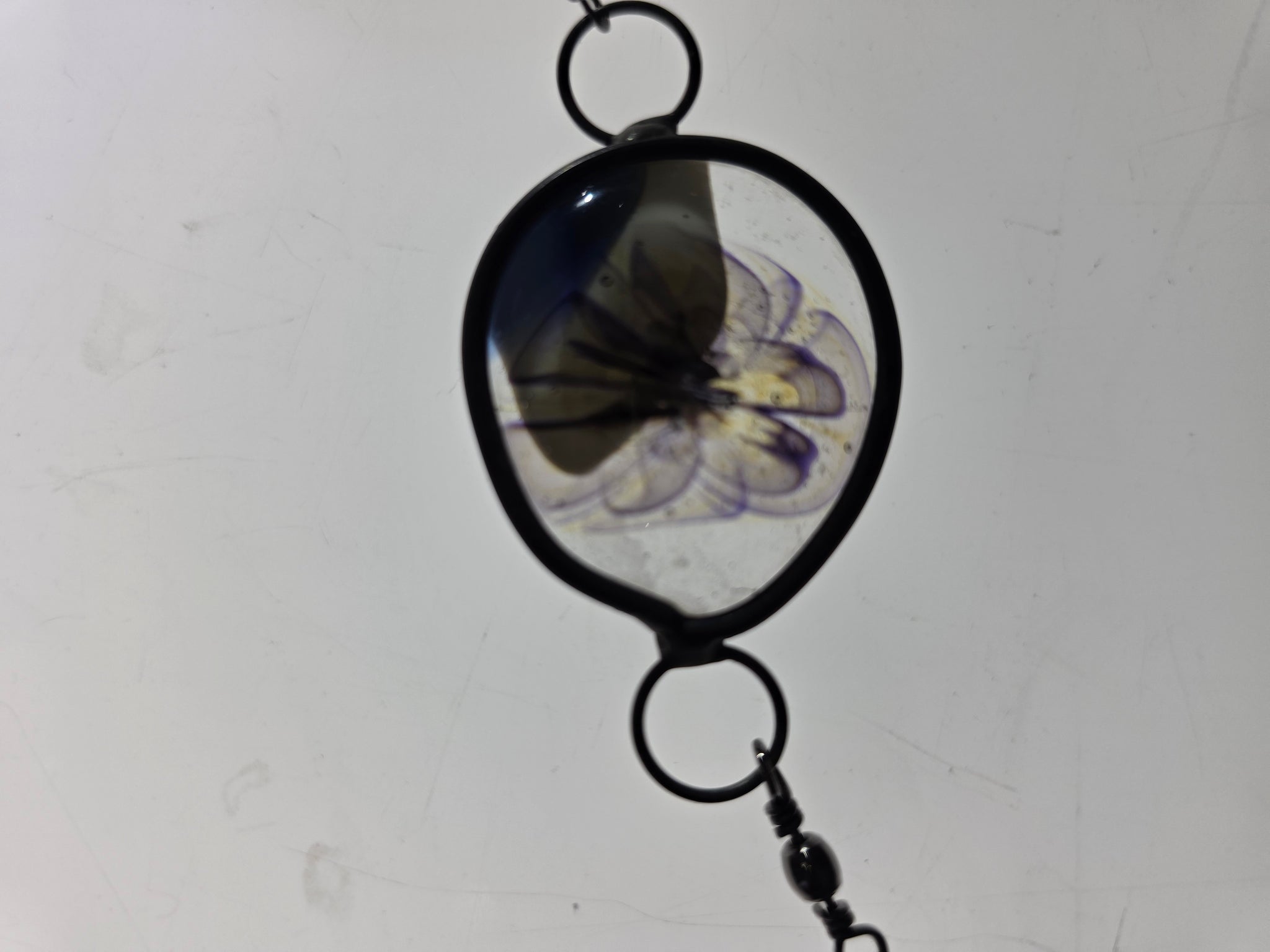 This glass chain unfolds as a sequence of soft gestures and quiet interruptions. Pale, milky ground glass carries layered movement—violet lines, smoky forms, and petal-like murrini elements that appear suspended within each link. Some shapes read as botanical, others as geological or anatomical, shifting with light and angle.